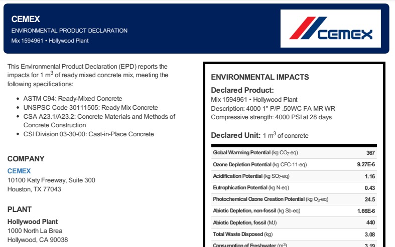 Once Cemex has produced a finished product, the question then becomes how can a specifier or developer verify that a concrete mixture is indeed lower carbon. This is where Environmental Product Declarations come in to play.